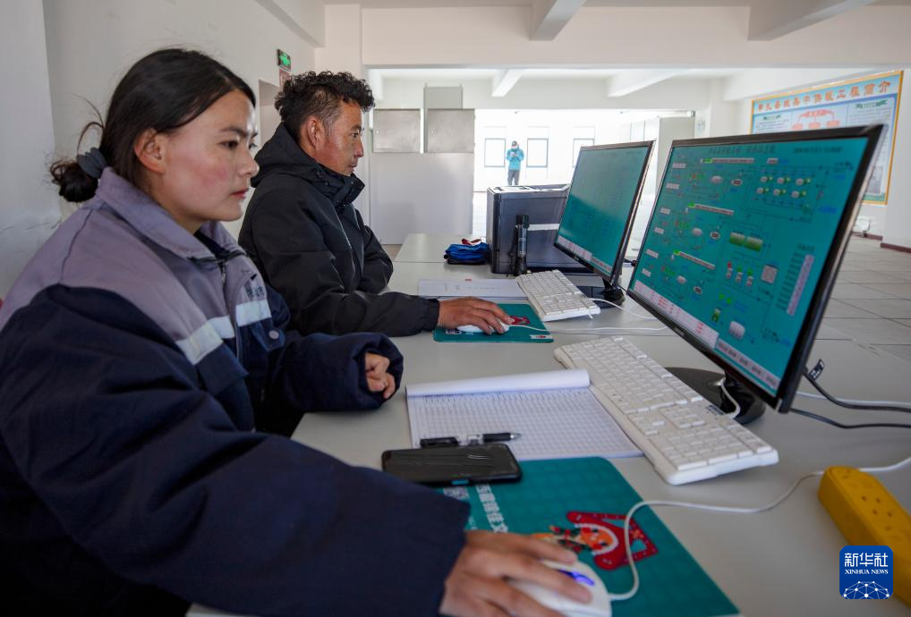 供暖工程的運(yùn)維管理方申扎凈地市政管理有限公司經(jīng)理?xiàng)顓⒖ê螅┖屯略诠芾硐到y(tǒng)上監(jiān)控供暖系統(tǒng)運(yùn)行(1月6日攝)。新華社記者 姜帆 攝