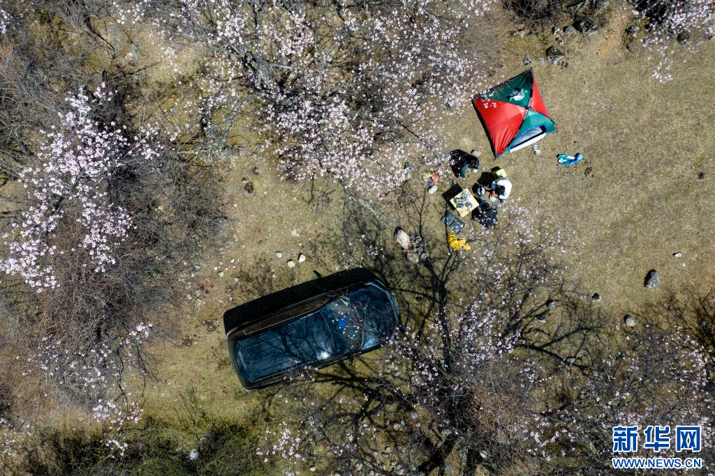 4月18日,群眾在嘉黎縣尼屋鄉(xiāng)境內桃花間“過林卡”(無人機照片)。新華網(wǎng) 旦增努布 攝