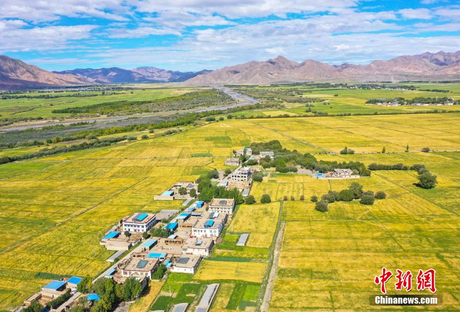 8月25日,西藏日喀則白朗縣仁青崗村,田園、村莊、河流、公路、遠山交相輝映,構成一幅美麗的田園風光畫卷。(無人機照片)