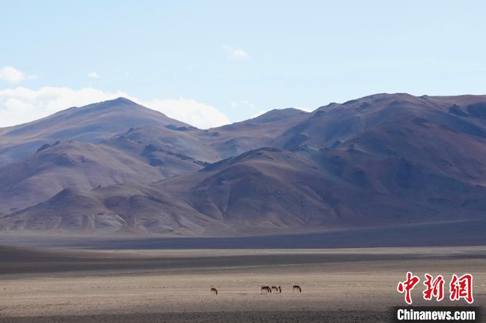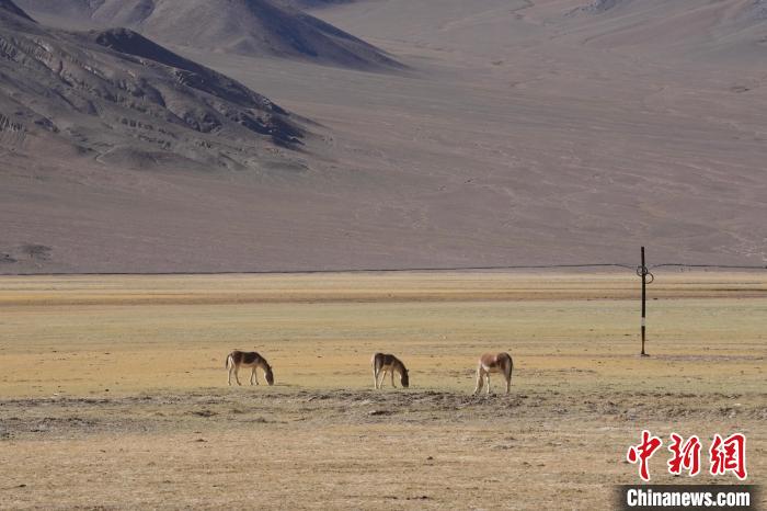 10月4日,西藏阿里地區(qū)日土縣,國家一級保護動物藏野驢在219國道旁的草地進食。中新社記者 崔楠 攝