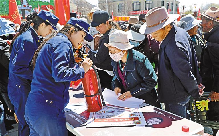 消防宣傳員在扎西曲登社區(qū)開展消防宣傳活動。