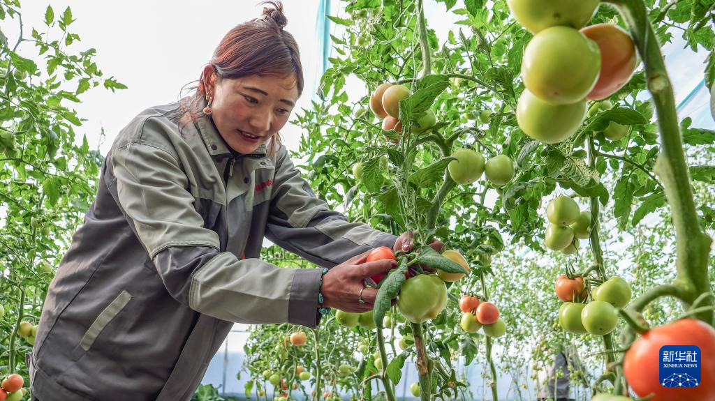 11月22日,在丁青縣農(nóng)業(yè)生態(tài)產(chǎn)業(yè)園,工作人員在采摘西紅柿。新華社記者 格桑朗杰 攝