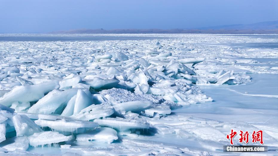 2月13日,青海省海南藏族自治州青海湖南岸,堆積在岸邊的冰塊在光線照射下呈藍冰景象,與周邊雪山、藍天、沙漠等大自然景色巧妙融合,吸引游客和攝影愛好者前來觀賞。圖為航拍青海湖藍冰。