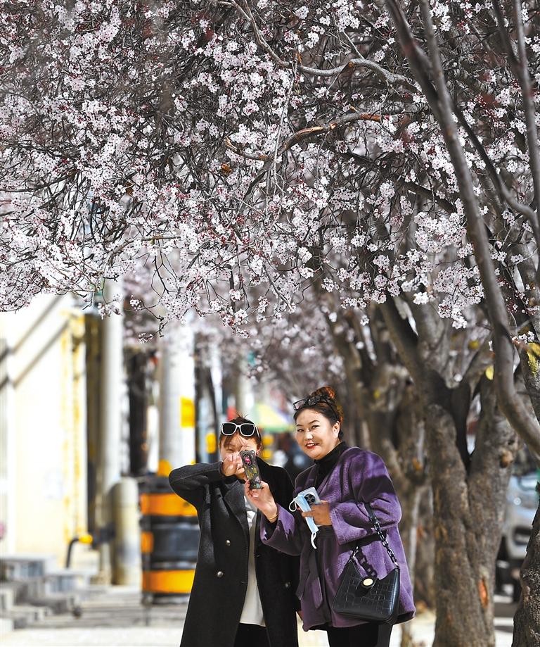 圖為市民在拉薩市軍民路盛開的桃花下拍照。記者 洛桑 攝