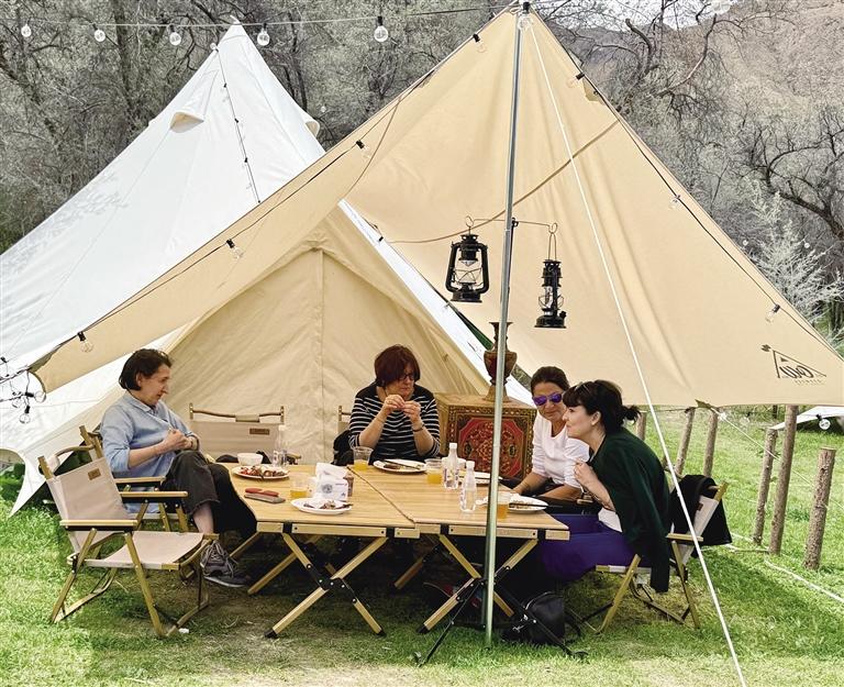 李女士說:“林卡中有一條小河流穿過,大人孩子可以在這里打水仗、坐船,玩累了還可以在這里燒烤,這就是我喜歡這里的原因?!背水?dāng)?shù)厝?,還有很多游客喜歡來這里體驗,喝一杯啤酒,跳一曲鍋莊舞,感受一下當(dāng)?shù)卮緲愕拿耧L(fēng)。
