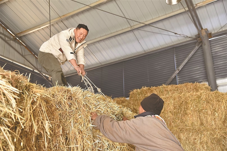圖為熱達與同事整理冬儲飼草。青海日報記者 余暉 攝