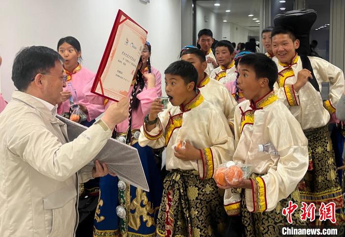 圖為果洛州青少年管樂團(tuán)的成員們領(lǐng)取獲獎(jiǎng)證書?!暵?攝