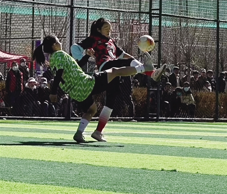 在徐州幼兒師范高等專(zhuān)科學(xué)校操場(chǎng)上,來(lái)自西藏拉薩的藏族女孩米央正在和朋友練習(xí)傳球、盤(pán)帶、變向、撥球……每逢課余時(shí)間,米央背著挎包,穿著足球裝備,出現(xiàn)在學(xué)校綠茵場(chǎng)上,赴一場(chǎng)午后球賽。這天踢完全場(chǎng)后的米央在場(chǎng)邊休息片刻,若有所思地翻看著手機(jī)里訓(xùn)練視頻。“這是暑假期間,在拉薩踢比賽的視頻,當(dāng)時(shí)我們踢得很盡興,現(xiàn)在很期待寒假繼續(xù)在拉薩踢比賽?!泵籽敫嬖V記者。顯然,她很想念在拉薩踢球的時(shí)光。