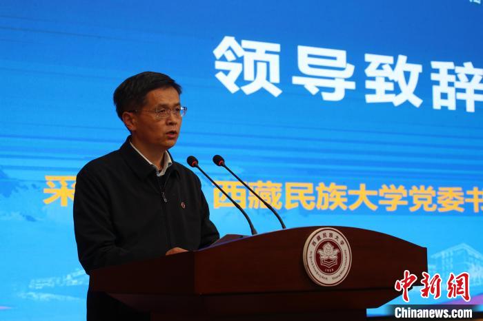 西藏民族大學黨委書記、副校長采守寬在第四屆“藏秦·喜馬拉雅”論壇開幕式發(fā)表致辭?!≈鬓k方供圖