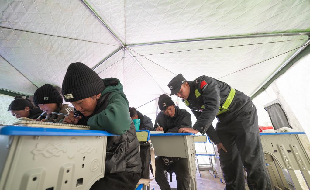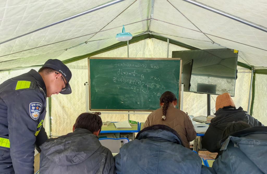 在西藏日喀則市定日縣長所鄉(xiāng)嘎布村安置點的帳篷內(nèi),民警劉鑫磊一手指了指黑板上的題目,一手拿著資料,耐心地給高三學生講解。5名學生坐在課桌前,低著頭,快速地在草稿紙上演算著。