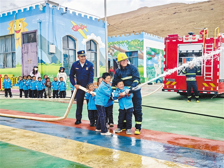 近日,西藏消防救援總隊的隊員駕駛著紅色消防車來到日喀則市定日縣扎西宗鄉(xiāng)班定村幼兒園,為師生們帶來了一堂別開生面的消防安全體驗課。