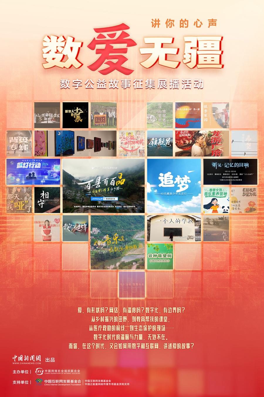 2024年11月起,中國網(wǎng)絡(luò)社會組織聯(lián)合會攜手中國互聯(lián)網(wǎng)發(fā)展基金會、中國新聞網(wǎng),由中國互聯(lián)網(wǎng)發(fā)展基金會中國正能量網(wǎng)絡(luò)傳播專項基金資助支持,組織開展“數(shù)愛無疆”數(shù)字公益故事征集展播活動,最終遴選出50個具有代表性的數(shù)字公益故事。