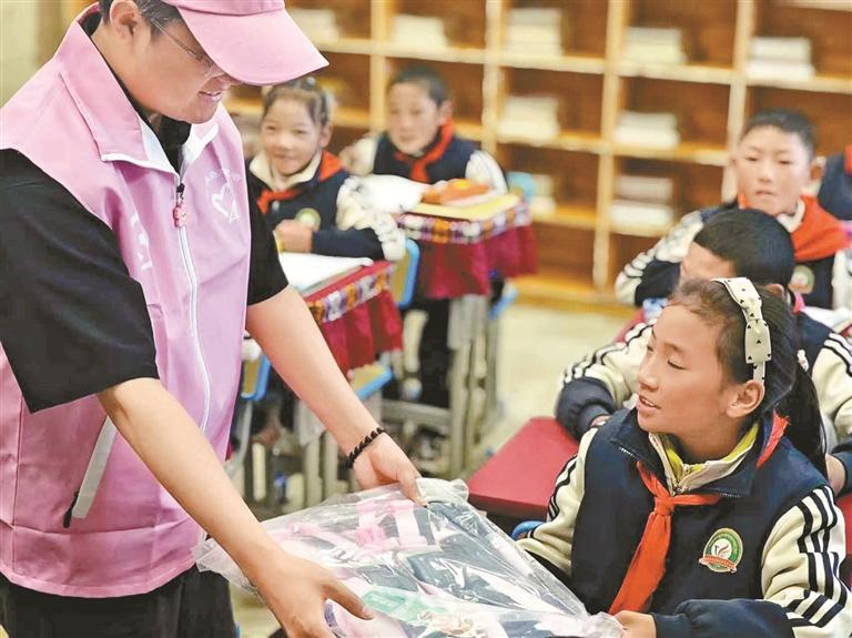 志愿者為孩子們分發(fā)小獎品。記者 鹿麗娟 通訊員 格桑央珍 攝影報道