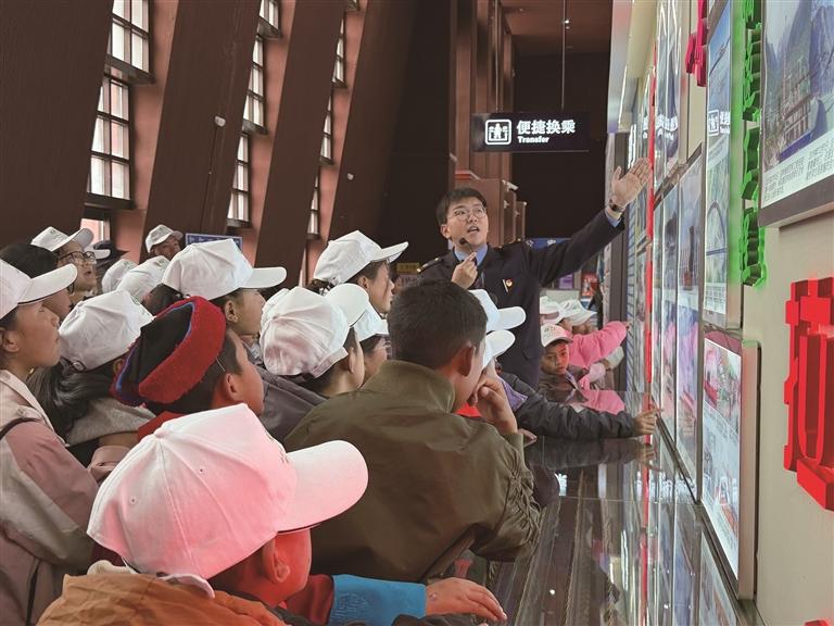 “這條全長435.48公里的鐵路,橋隧比高達(dá)75%,結(jié)束了藏東南地區(qū)不通鐵路的歷史!”隨著工作人員的講解,同學(xué)們的目光追隨著沙盤上的鐵軌延伸,理解了這條鐵路修建的困難程度,更讀懂了這條鐵路對“加強聯(lián)系交流、維護(hù)民族團(tuán)結(jié)”的重要意義。