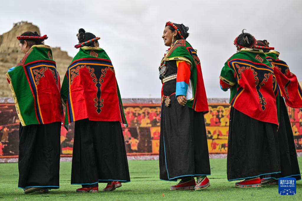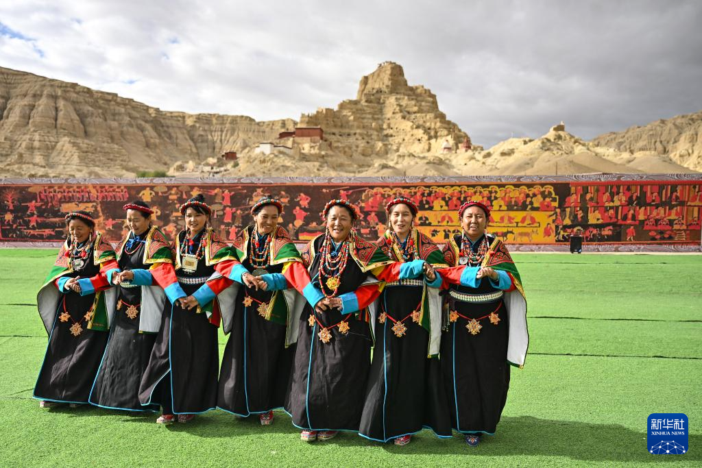 在西藏阿里地區(qū)札達(dá)縣古格王國遺址腳下,當(dāng)?shù)卮迕癖硌荨靶琛焙蠡ハ嘟涣鳎?月11日攝)。新華社記者 孫瑞博 攝 ??