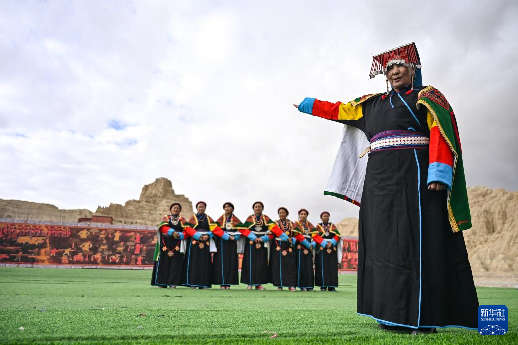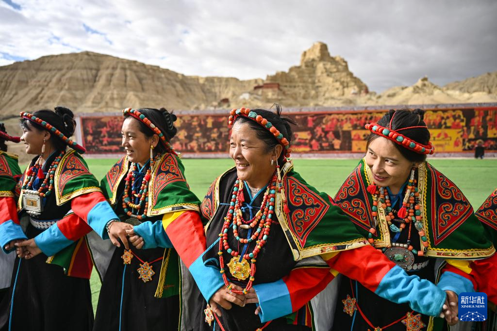 在西藏阿里地區(qū)札達(dá)縣古格王國遺址腳下,自治區(qū)級“宣舞”非遺傳承人央金(右)介紹“宣舞”(9月11日攝)。新華社記者 孫瑞博 攝 ??