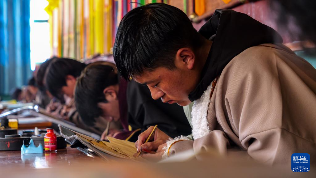 11月22日,昌都市丁青縣擁忠文化藝術(shù)中心非遺扶貧就業(yè)工坊學員在練習藏文書法。新華社記者 普布次仁 攝