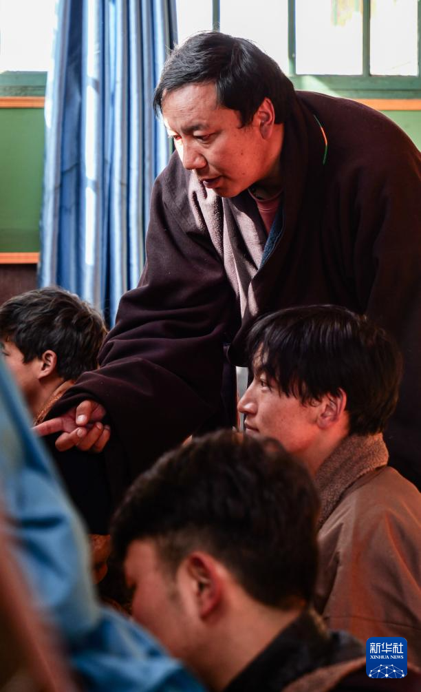 11月22日,昌都市丁青縣擁忠文化藝術(shù)中心非遺扶貧就業(yè)工坊老師在指導學員寫藏文書法。新華社記者 格桑朗杰 攝