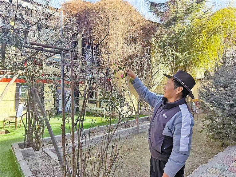 拉薩市城關(guān)區(qū)慈覺林村村民次頓珠在清理院子里的月季樹枝。 記者 文鳳 攝