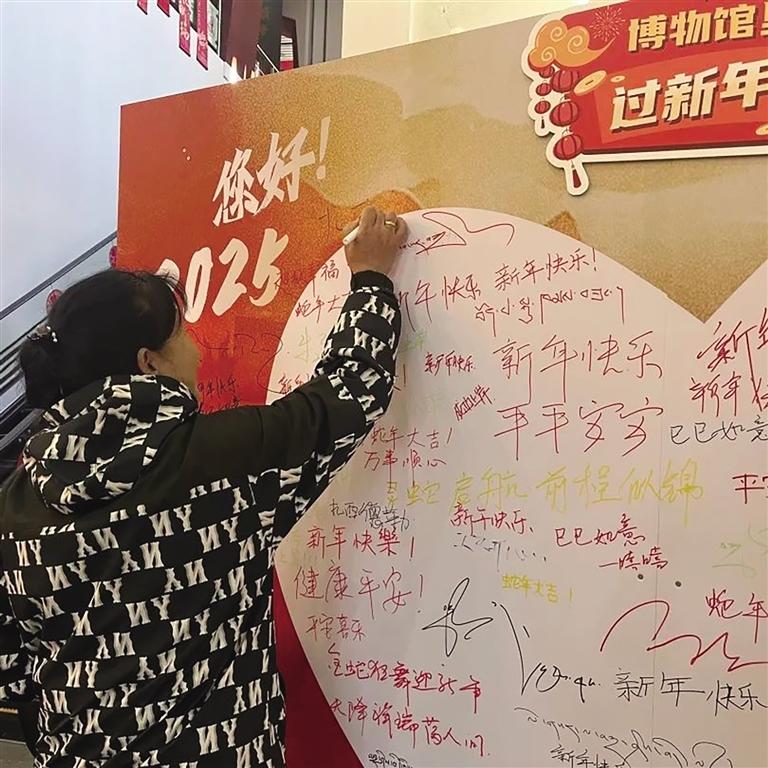 活動(dòng)期間,博物館大廳的新年愿望墻備受歡迎,成為觀眾們的熱門打卡點(diǎn)。人們紛紛在心愿貼上寫下對(duì)新年的美好期許,隨后領(lǐng)取博物館精心準(zhǔn)備的節(jié)日紀(jì)念品。同時(shí),博物館推出的集卡集章活動(dòng)也吸引了眾多參與者。觀眾們通過參與館內(nèi)各項(xiàng)活動(dòng)收集紀(jì)念章,就有機(jī)會(huì)在年末收獲博物館準(zhǔn)備的神秘大獎(jiǎng),這一活動(dòng)極大地激發(fā)了大家的參與熱情。