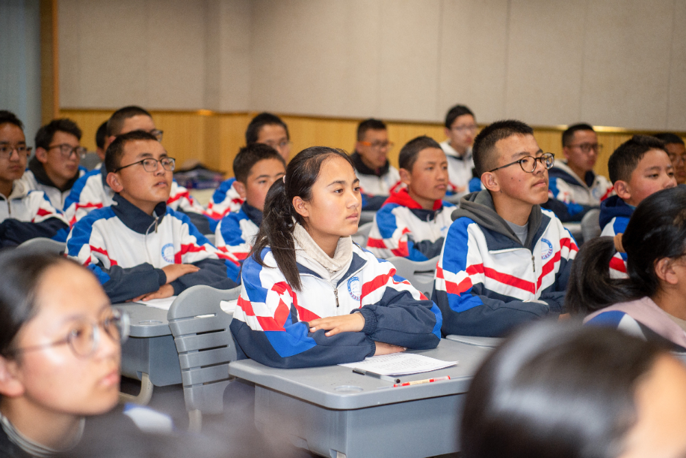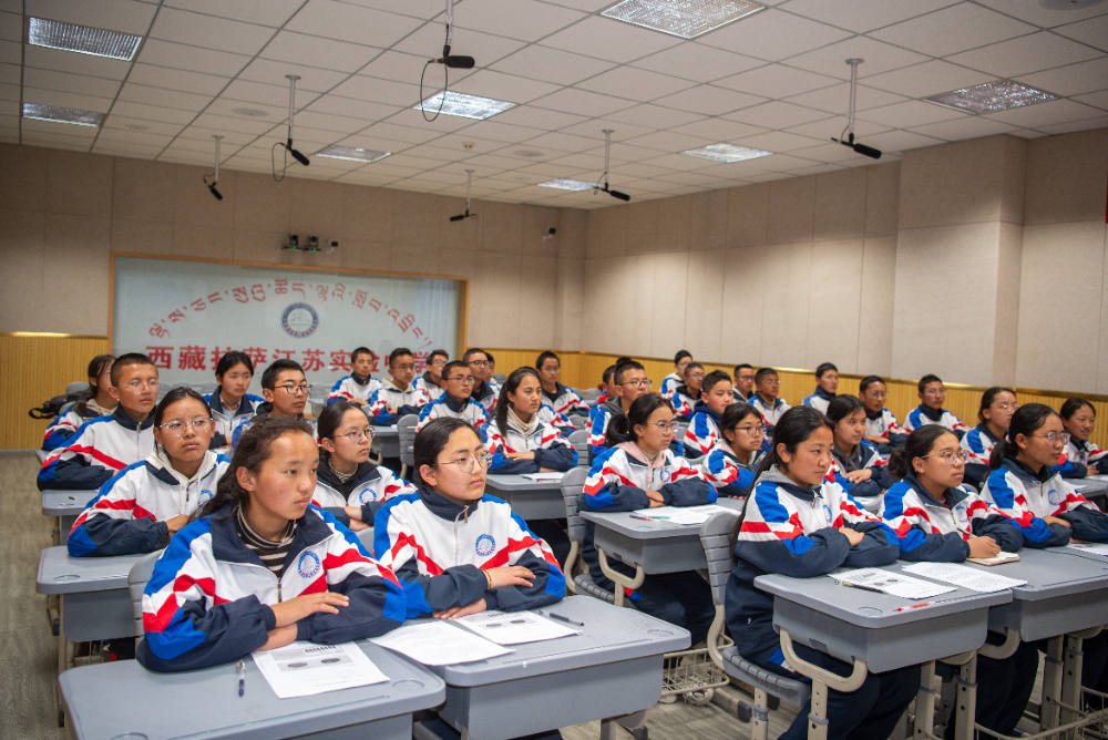 4月11日,拉薩江蘇實驗中學(xué)的學(xué)生在認(rèn)真聽江蘇省如東高級中學(xué)的宣講。新華網(wǎng) 旦增努布 攝?
