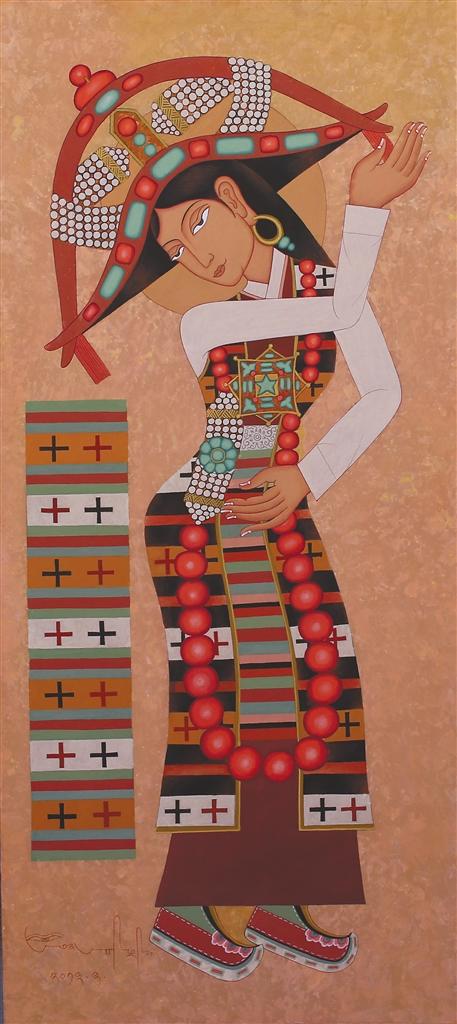 在昂桑“傳統(tǒng)當隨時代”的藝術(shù)理念浸潤下,徒弟們總能在傳統(tǒng)與當代的碰撞中找到獨特的表達坐標:來自日喀則的藝術(shù)家多吉次旺,早年被昂桑畫作中藏文元素與抽象色塊的融合所震撼。如今在拉薩創(chuàng)辦工作室的他,正將藏文書法的中鋒筆觸解構(gòu)為流動的視覺符號——烏金體的頓挫韻律幻化為色彩的潮涌,在畫布上重現(xiàn)古老史詩的“當代心跳”;而主演《文成公主》實景劇的馮佳,這位四川傳媒大學表演系的畢業(yè)生,跟隨昂桑學畫四年,已能在《文成公主》系列中將唐卡礦物顏料的莊重與波普藝術(shù)的色塊切割并置,讓歷史人物既保有壁畫般的莊重感,又流淌著屬于時代的視覺節(jié)奏。