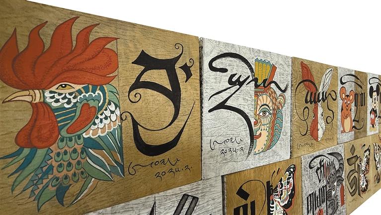 在昂桑的工作室中,《一日一畫》系列尤為醒目:藝術(shù)家采用布面重彩技法,讓唐卡礦物顏料與現(xiàn)代丙烯顏料滲透交融,傳統(tǒng)吉祥紋樣與幾何抽象圖案共生。韓書力評價:“他讓千年顏料與當代審美共振,完成傳統(tǒng)藝術(shù)的‘基因重組’?!?/p>