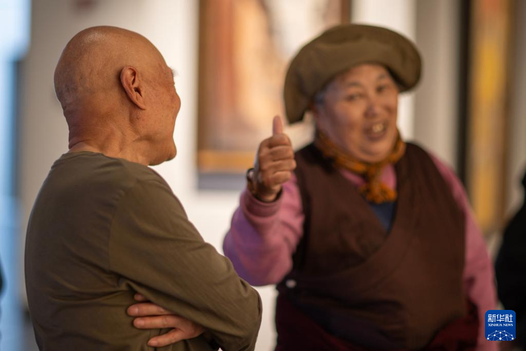一位藏族觀眾在西藏美術(shù)館參觀張鷹的畫展時夸贊他的畫(5月13日攝)。新華社記者 姜帆 攝??