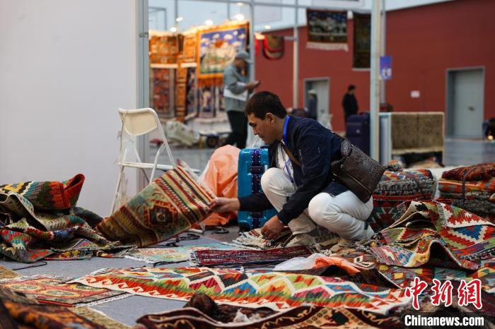 圖為來自巴基斯坦的參展商在擺放地毯。中新社記者 薛蒂 攝