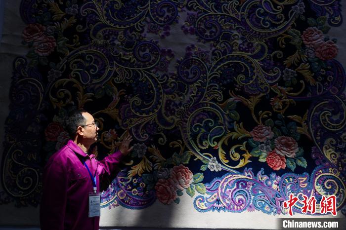 圖為青海參展商介紹展出的地毯。中新社記者 薛蒂 攝