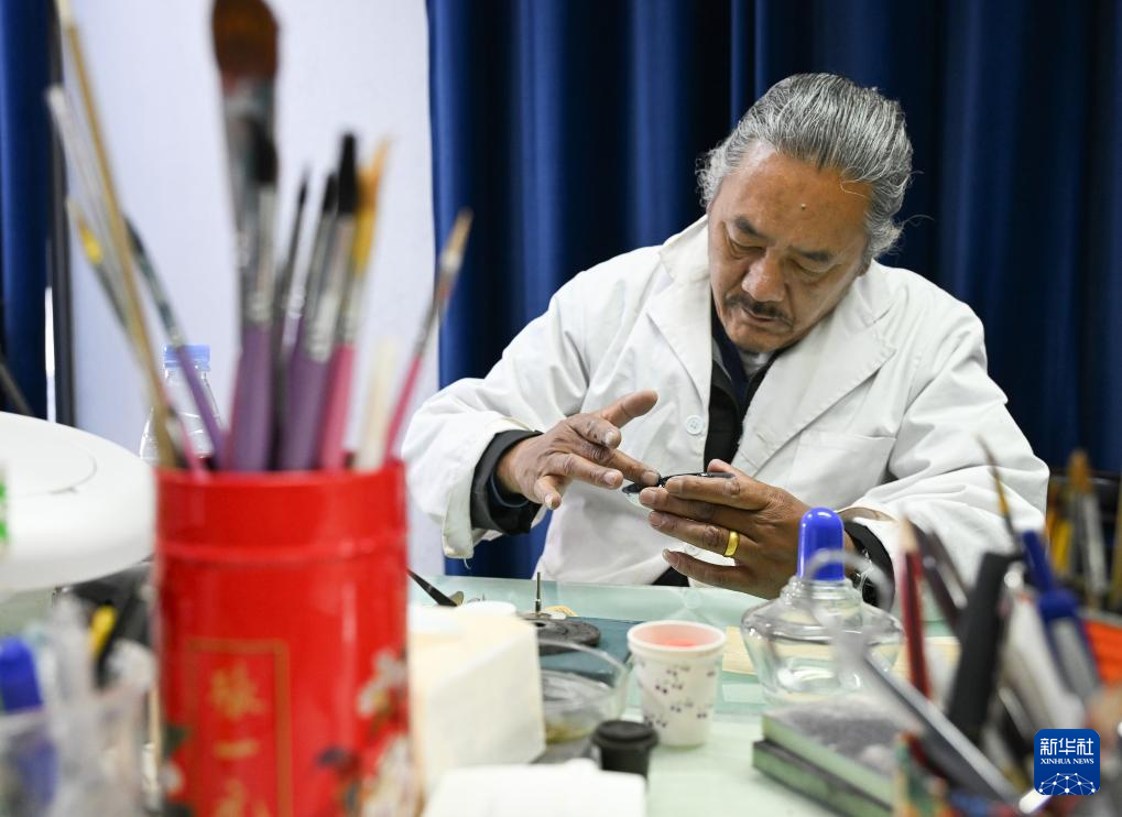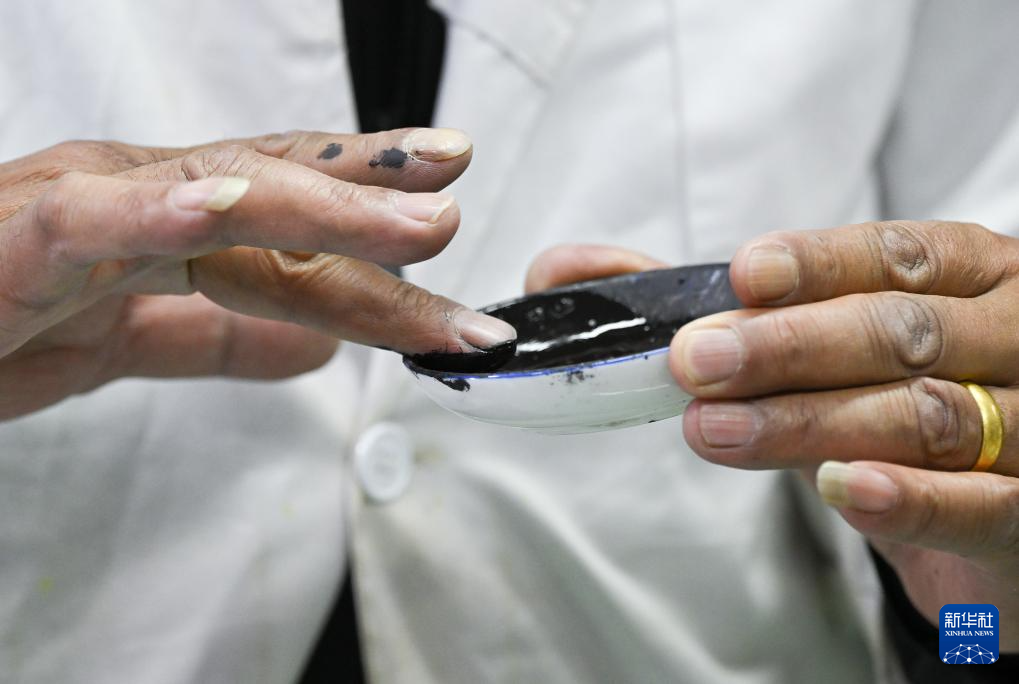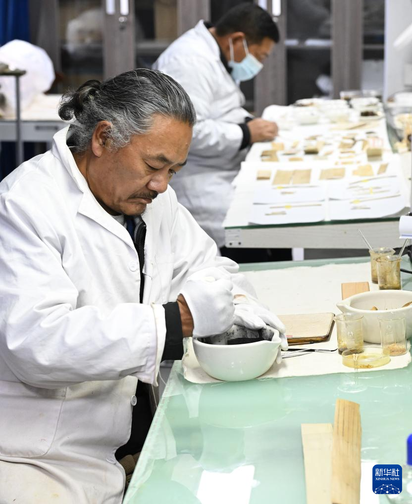 布達(dá)拉宮貝葉經(jīng)實(shí)驗(yàn)性修復(fù)小組實(shí)驗(yàn)室工作人員對(duì)用于貝葉修復(fù)的顏料進(jìn)行研磨處理(5月25日攝)。新華社記者 旦增尼瑪曲珠 攝?
