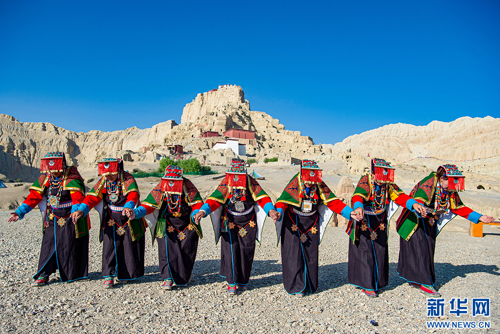 札達(dá)縣群眾在古格王國(guó)遺址腳下表演“宣舞”(6月12日攝)?!靶琛笔俏鞑匕⒗锩耖g傳統(tǒng)舞蹈,融合藏戲、舞蹈、說唱等傳統(tǒng)民間藝術(shù),內(nèi)容涵蓋禮儀、風(fēng)俗、節(jié)慶等。2008年,被列入國(guó)家級(jí)非物質(zhì)文化遺產(chǎn)名錄。新華網(wǎng) 旦增努布 攝