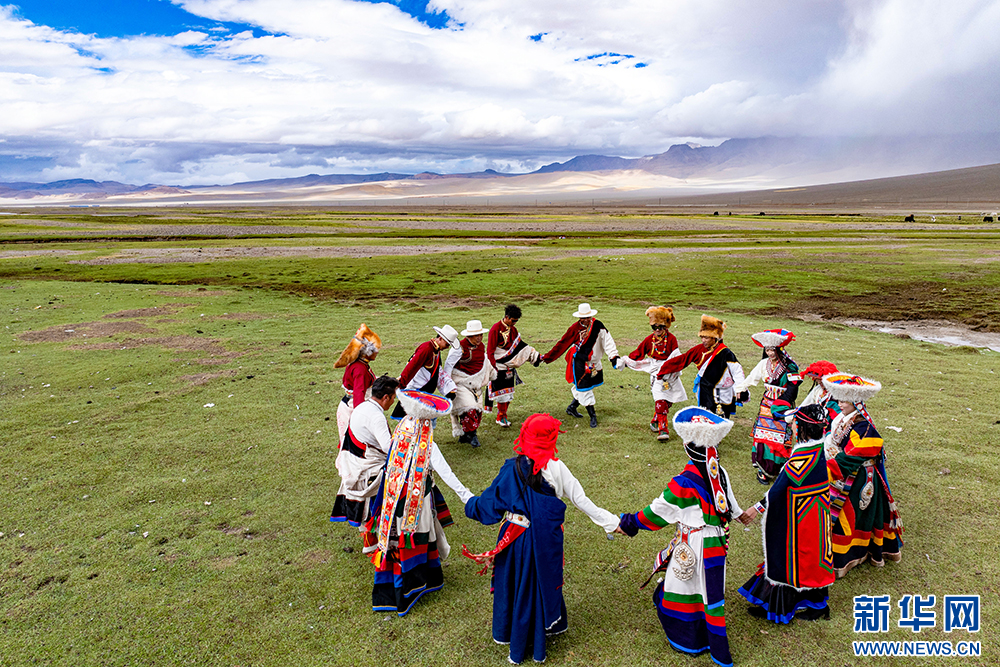 日土縣群眾在演唱自治區(qū)級(jí)非物質(zhì)文化遺產(chǎn)“諧巴諧瑪”(6月16日攝)。據(jù)悉,“諧瑪”有12個(gè)唱腔法,“諧巴”有9個(gè)唱腔法,每個(gè)唱腔都有不同的舞步和舞蹈姿勢(shì)。新華網(wǎng) 旦增努布 攝