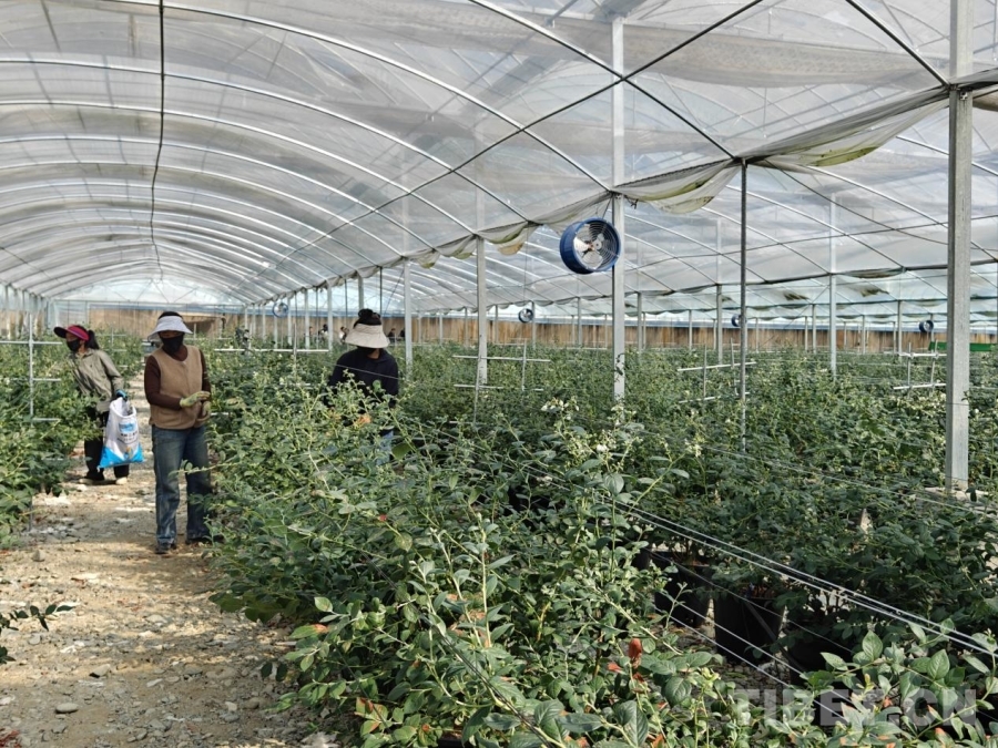 圖為戈壁田園現(xiàn)代農(nóng)業(yè)項(xiàng)目?jī)?nèi)待結(jié)果的藍(lán)莓花