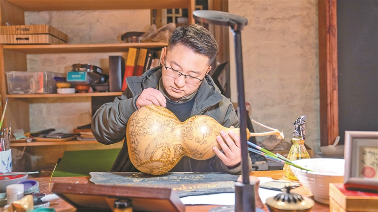 就像做掐絲葫蘆,他會(huì)先有線稿,但最終會(huì)根據(jù)葫蘆本身的形狀與色澤,讓唐卡圖案與掐絲紋樣在制作中相互調(diào)整、逐步呈現(xiàn)?!熬拖癫菰系暮樱兴牧飨?,你只需順著它的流勢(shì),稍加引導(dǎo)就好?!边@種“因材施藝、順勢(shì)而為”的創(chuàng)作態(tài)度,讓他的作品既有手作的溫度,又透著一股生動(dòng)的自由。