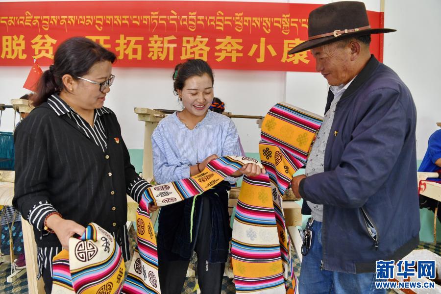 2020年7月6日,西藏扎囊縣吉汝鄉(xiāng)扎西林村駐村工作隊隊長央珍(左)、黨支部書記旺扎(右)和專業(yè)合作社社員次旺曲珍查看民族手工業(yè)(邦典)質(zhì)量。 新華社記者 張汝鋒 攝