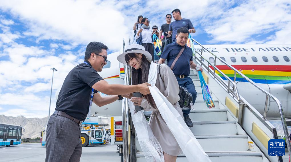 在西藏航空“地球第三極號”飛機首航儀式現場,工作人員為游客獻上哈達(8月25日攝)。新華社發(fā)(丁增尼達攝)