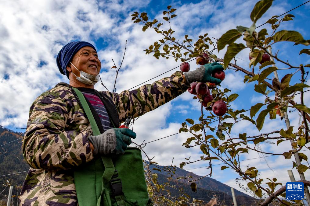 米林市羌納鄉(xiāng)西藏林芝現(xiàn)代蘋果標準化園區(qū)內,農民在采摘蘋果(11月13日攝)。新華社記者 姜帆 攝
