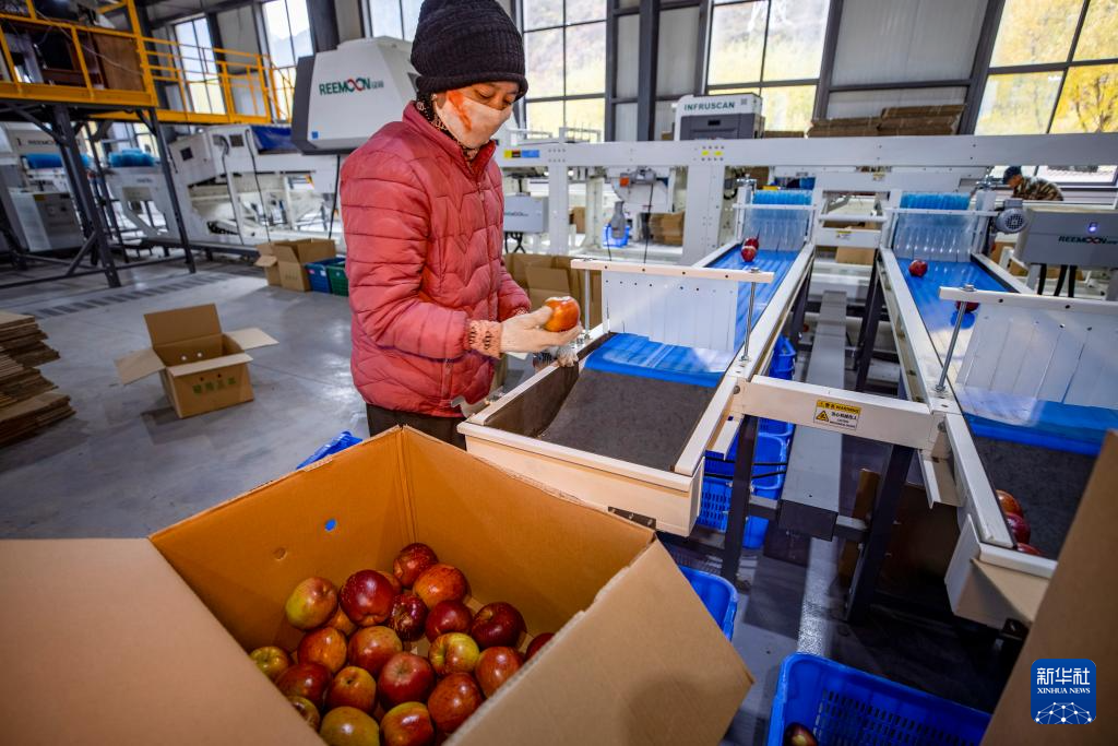 米林市羌納鄉(xiāng)西藏林芝現(xiàn)代蘋果標準化園區(qū)分揀車間內,工人在流水線上分揀蘋果(11月13日攝)。新華社記者 姜帆 攝