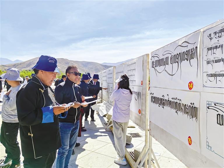 圖為在謝通門縣開展的書法、繪畫、攝影比賽中,評(píng)委在為作品打分。