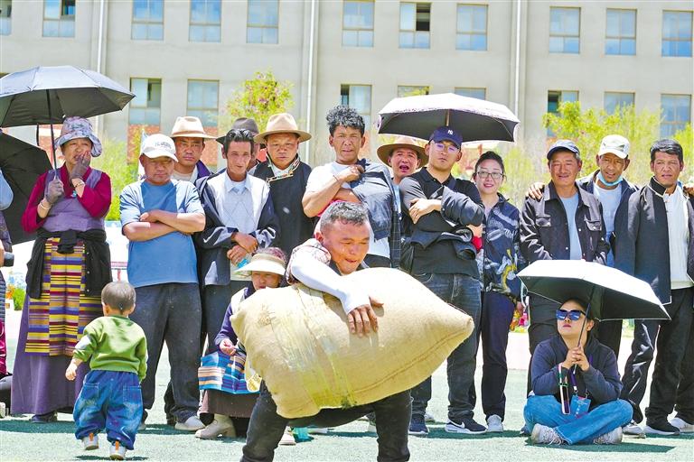 圖為桑珠孜區(qū)城北街道舉辦慶祝第八個(gè)“日喀則市民族團(tuán)結(jié)進(jìn)步日”暨“全民來健身 健康你我他”社區(qū)運(yùn)動(dòng)會(huì)。這是參賽選手在進(jìn)行抱石頭比賽。