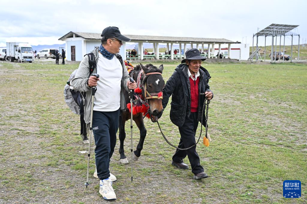 9月8日,在普蘭縣巴嘎鄉(xiāng)崗莎村,當?shù)卮迕裾隣恐R和游客同行。新華社記者孫瑞博 攝