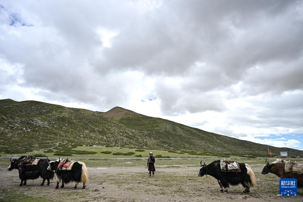 9月8日,在普蘭縣巴嘎鄉(xiāng)崗莎村,牧民正在驅趕牦牛運送轉山游客的貨物。新華社記者孫瑞博 攝