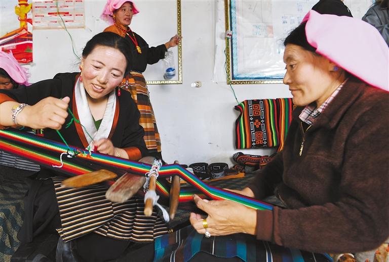 圖為木托村婦委會主任措吉卓嘎(左前)和合作社成員切磋編織技藝。新華社記者 張汝鋒 攝