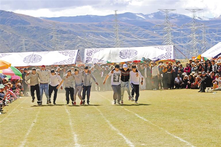 圖為農(nóng)牧民參加三人兩足比賽。 本報(bào)記者 旦增嘎瓦 攝