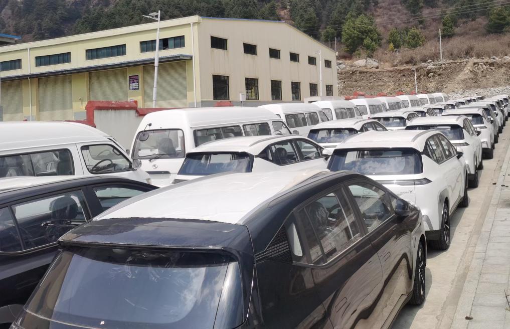 在日喀則市吉隆邊境經(jīng)濟合作區(qū),一批新能源汽車等待出口。新華社記者魏冠宇 攝