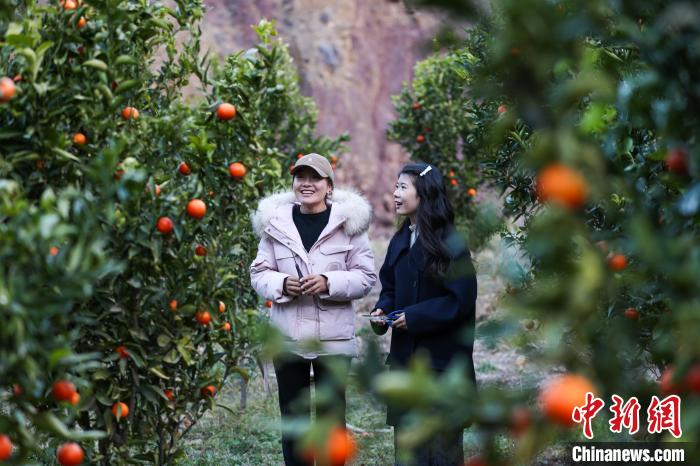 12月20日,冬至前夕,西藏自治區(qū)昌都市芒康縣納西民族鄉(xiāng)加達(dá)村橘子園里一片繁忙景象。納西民族鄉(xiāng)地處瀾滄江河谷,以山地為主,瀾滄江穿境而過,河谷地帶土地肥沃,黃澄澄的康巴蜜橘掛滿枝頭,果農(nóng)們穿梭其中,熟練地采摘已成熟的果實(shí)。圖為游客在橘子園中自拍留念。中新社記者 薛蒂 攝