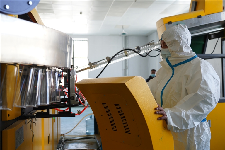 霞崗江實業(yè)公司工作人員操作飲用水產(chǎn)品包裝設(shè)備。記者 洛桑旦增 達珍 攝