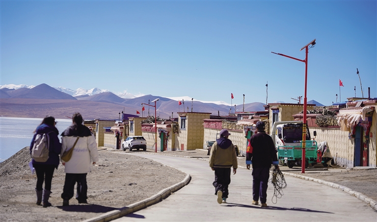 浪卡子縣打隆鎮(zhèn)推瓦村,南部與不丹接壤,邊界線長(zhǎng)達(dá)25公里,是世界上海拔最高的純牧業(yè)行政村之一。全村共有40戶(hù)人家,153位村民在此生活。2月6日,記者踏入推瓦村,首先映入眼簾的是遠(yuǎn)處的普姆擁措湖,湖面在陽(yáng)光的照耀下波光粼粼,與錯(cuò)落有致的雪山相互映襯,構(gòu)成一幅絕美的畫(huà)面。沿著平坦的柏油馬路前行,道路兩旁整齊排列的路燈和一排排以溫馨黃色為主色調(diào)的邊境小康房格外引人注目。漫步在臨近冰湖的村路上,悠然愜意之感油然而生,雪山、湖泊、村落與村民們和諧相融,共同繪就了一幅寧?kù)o祥和的鄉(xiāng)村畫(huà)卷。