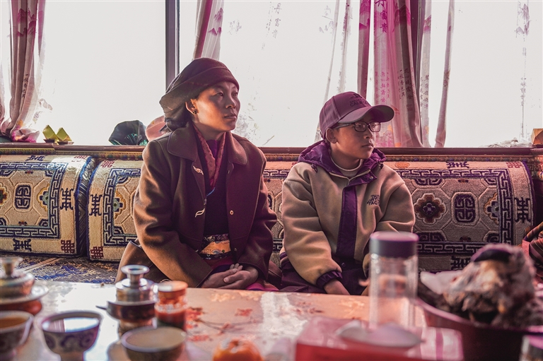 當(dāng)日,天空晴朗,在廣袤無(wú)垠、無(wú)樹(shù)木遮擋的曠野上,稍起一陣疾風(fēng),便會(huì)揚(yáng)起一層薄薄的黃沙。從村委會(huì)出發(fā),沿著冰湖畔的水泥小路前行,很快就來(lái)到了村民倫珠曲珍的家。一進(jìn)屋,厚實(shí)的木門(mén)便將凜冽的寒風(fēng)擋在了門(mén)外。“快請(qǐng)進(jìn),這幾天風(fēng)沙有點(diǎn)大,普莫雍措都沒(méi)以前藍(lán)了?!眰愔榍湟贿呹P(guān)門(mén)一邊熱情地笑著說(shuō)道。